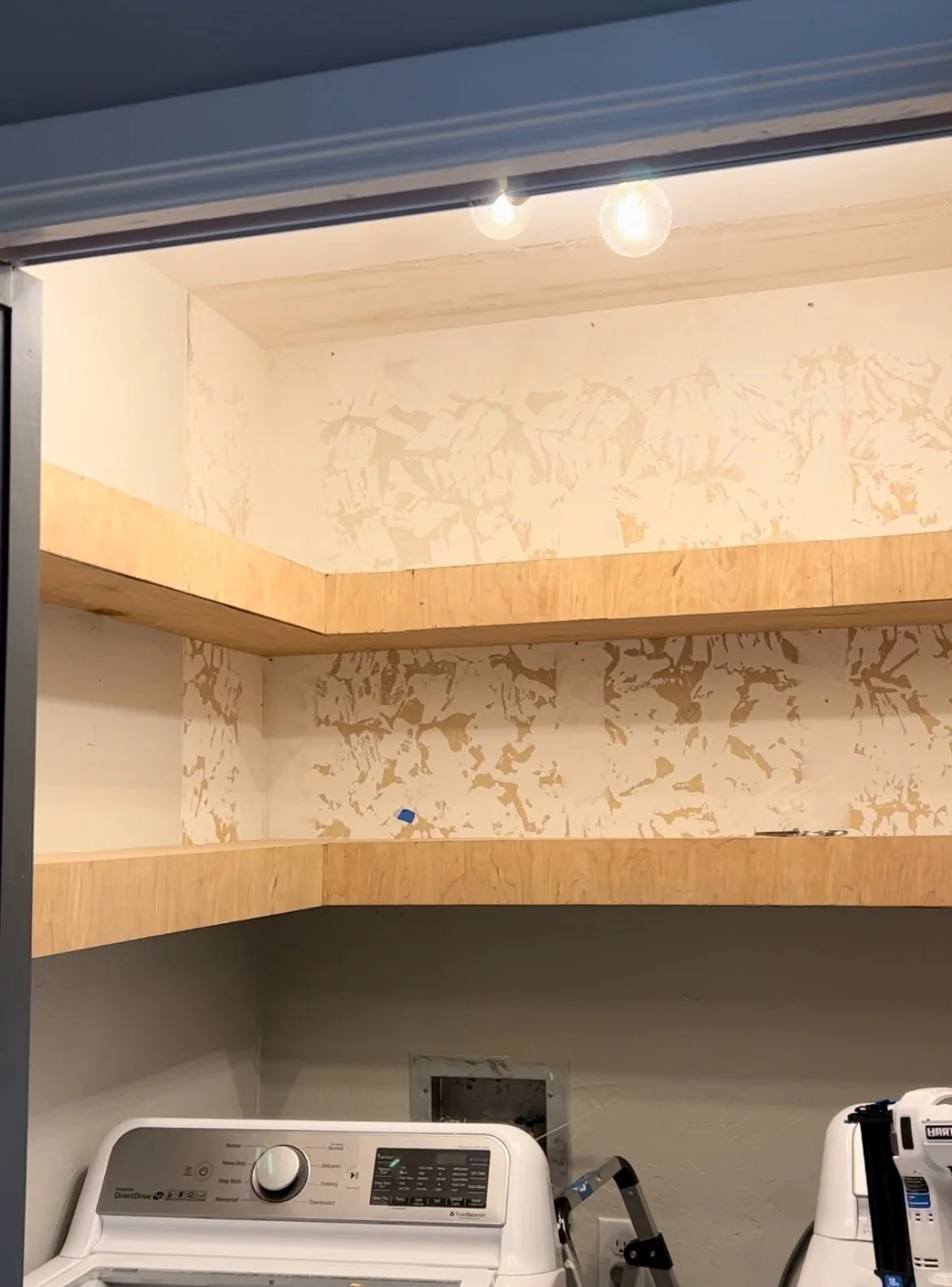 I decided I wanted floating shelves that wrapped around the closet because the current cabinets were not functional. They were too high, the doors never closed and I couldn't reach across the washer & drier to even put anything in them. I figured having the shelves wrap around would make things more accessible for me, and add more storage space. So, I decided to DEMO!! The demolition was probably the most fun of this project. First, I took of the doors of the cabinets. I then used a prybar to remove all of the trim. I used my HART reciprocating saw to cut the cabinets into smaller pieces since they were nailed into the wall with 6" nails. Learning how the previous owners installed these cabinets makes me very scared to ever attempt the much needed kitchen renovation.