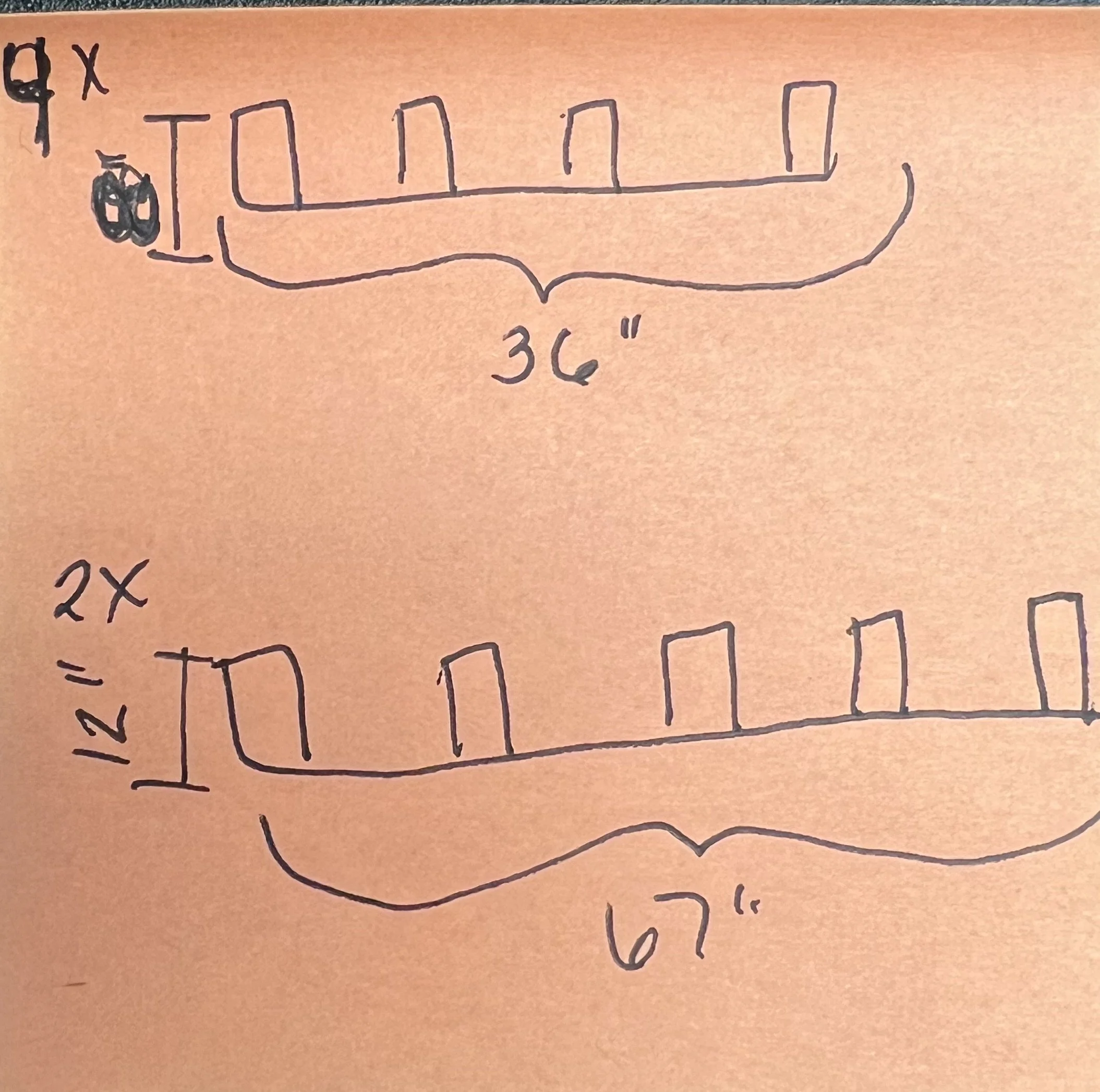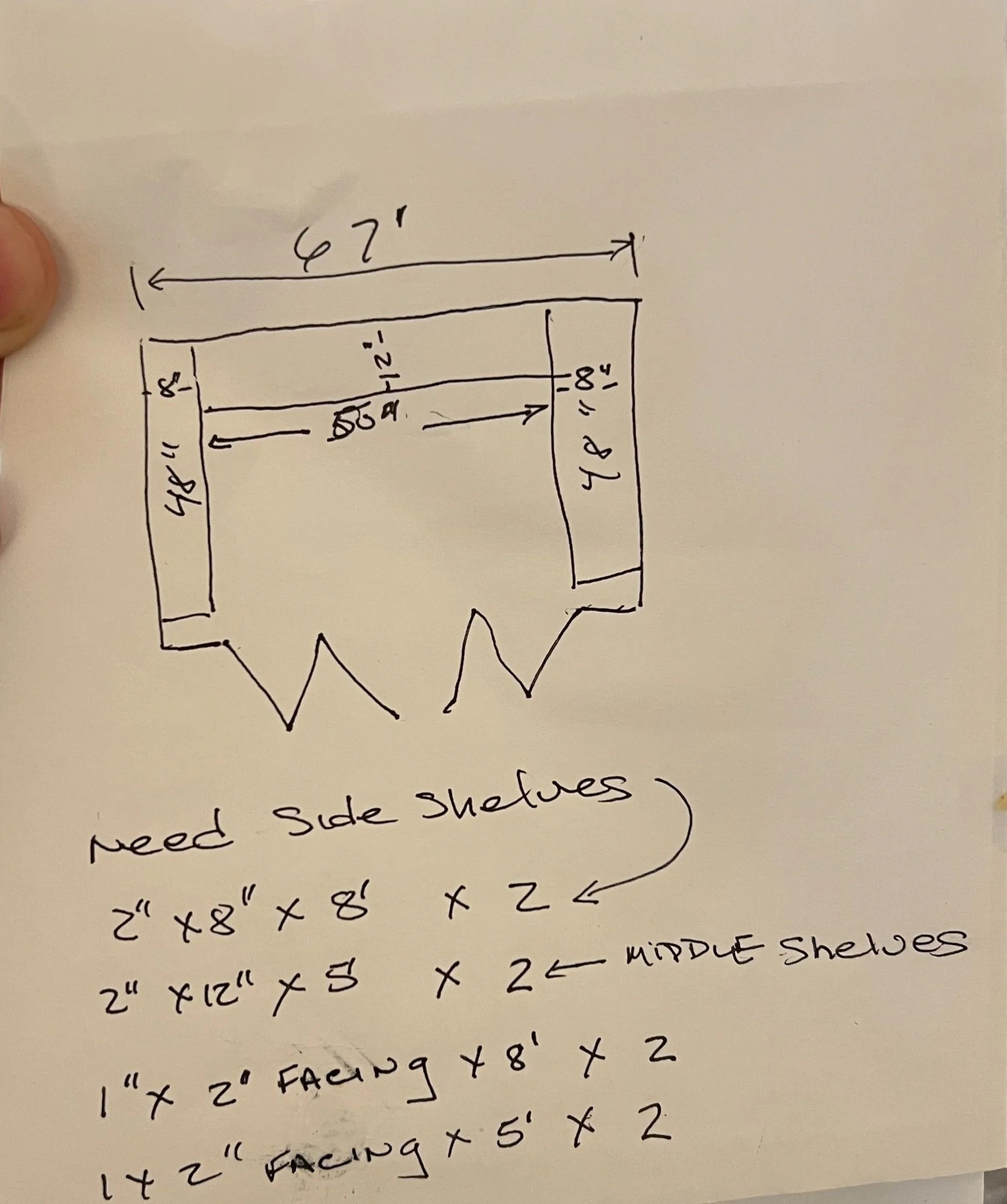 Originally, I was going to use these floating shelf brackets, drill into a 2"x8" and 2"x12" piece of wood, and insert the brackets. Here is the drawing of my plan, drawn out by none other than my incredible father! However, after seeing how expensive these brackets were with how many I would need, I decided I was just going to build my own cleats.